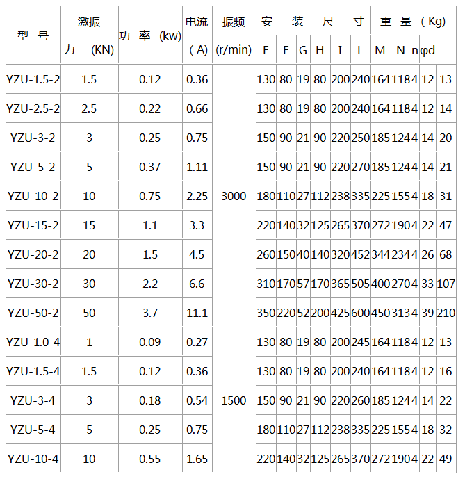 YZU振動電機型號有很多種,如:YZU-1.5-2、YZU-2.5-2、YZU-3-2、YZU-5-2、YZU-10-2、YZU-15-2、YZU-20-2、YZU-30-2、YZU-50-2等。