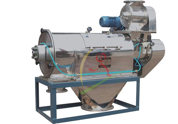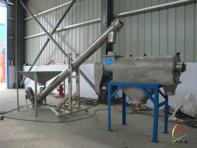 臥式氣流篩擯棄重力勢(shì)能作用原理,采用空氣作載體,利用動(dòng)能做功的原理來(lái)工作。當(dāng)物料通過(guò)螺旋輸送系統(tǒng)后,和氣流混合、進(jìn)入篩機(jī)風(fēng)輪中間;通過(guò)風(fēng)輪葉片施加離心力,向桶型篩網(wǎng)噴射過(guò)網(wǎng)。超徑物料不能過(guò)網(wǎng),由自動(dòng)排渣口排出,從而達(dá)到快速篩分的目的。