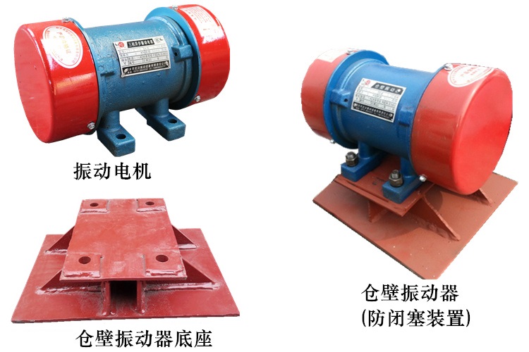 由振動(dòng)電機(jī)、底座兩部分組成。振動(dòng)電機(jī)和底座由螺栓緊密地固定為一體,由于底座堅(jiān)固地安裝在料倉(cāng)壁上,這樣就構(gòu)成了單質(zhì)點(diǎn)定向振動(dòng)系統(tǒng)。當(dāng)防閉塞裝置工作時(shí),振動(dòng)電機(jī)的高速轉(zhuǎn)動(dòng),便產(chǎn)生了對(duì)料倉(cāng)壁的周期性高頻振動(dòng),由于防閉塞裝置的周期性振動(dòng),一方面使物料與倉(cāng)壁脫離接觸、消除物料與倉(cāng)壁的摩擦,另一方面使物料受交變速度和加速度的影響,處于不穩(wěn)定狀態(tài),從而有效地克服物料的內(nèi)摩擦力和聚集力,以消除料倉(cāng)內(nèi)物料間的相對(duì)穩(wěn)定性,使物料從料倉(cāng)口順利排出。