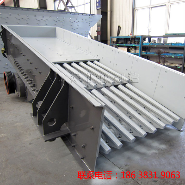 振動(dòng)給料機(jī)由振動(dòng)電機(jī)、給料槽、彈簧支座和傳動(dòng)裝置等部件組成。振動(dòng)給料機(jī)的動(dòng)力來(lái)源是振動(dòng)電機(jī),工作時(shí),振動(dòng)電機(jī)的偏心塊旋轉(zhuǎn)產(chǎn)生激振力,帶動(dòng)給料槽振動(dòng),使物料沿著類似圓形的軌跡做跳躍運(yùn)動(dòng),物料連續(xù)不斷運(yùn)動(dòng),達(dá)到輸送物料的目的。在砂石生產(chǎn)線中經(jīng)常使用的兩種振動(dòng)給料機(jī)結(jié)構(gòu)是鋼板結(jié)構(gòu)和篦條結(jié)構(gòu),鋼板結(jié)構(gòu)的振動(dòng)給料機(jī)可以將物料均勻穩(wěn)定的送入破碎設(shè)備中,篦條結(jié)構(gòu)的振動(dòng)給料機(jī)不但能輸送物料,還可以在輸送過(guò)程中對(duì)物料進(jìn)行粗篩分,配置在制砂系統(tǒng)中更經(jīng)濟(jì)合理。振動(dòng)給料機(jī)調(diào)節(jié)性能好,可以達(dá)到不同物料的給料需求。