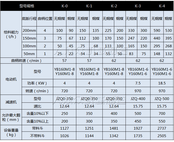 K型往復式給煤機技術參數: